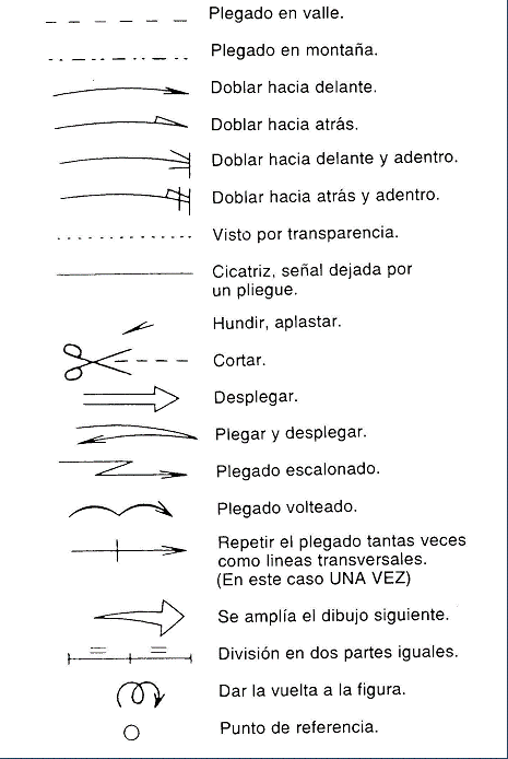 Todos los pliegues de un diagrama tienen una representación gráfica compuesta por un tipo de línea y una flecha asociada, para que bien con una o bien con otra sepamos como debemos doblar.